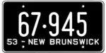 1953 | Embossed white serial on black plate with border line; "53 – NEW BRUNSWICK" at bottom | none | 12·345 | 1·000 to approximately 68·000 | |