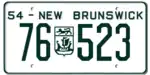 1954 | Embossed green serial on white plate with border line; embossed provincial shield used as separator; "54 - NEW BRUNSWICK" at top | none | 12-345 | 1-000 to approximately 77-000 | |