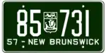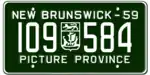 1959 | Embossed white serial on green plate with border line; embossed provincial shield used as separator; "NEW BRUNSWICK – 59" at top | "PICTURE PROVINCE" centred at bottom | 123-456 | 10-00 to approximately 110-000 | |