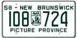 1958 | Embossed green serial on white plate with border line; embossed provincial shield used as separator; "58 – NEW BRUNSWICK" at top | "PICTURE PROVINCE" centred at bottom | 123-456 | 10-00 to approximately 109-000 | |