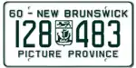 1960–61 | As 1958 base, but with "60 – NEW BRUNSWICK" at top | "PICTURE PROVINCE" centred at bottom | 123-456 | 10-00 to approximately 130-000 | Revalidated for 1961 with windshield stickers. |