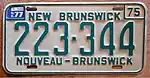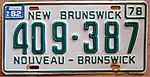 1972–74 | Embossed green serial on reflective white plate; border lines around plate and around top corners; "NEW BRUNSWICK" and "NOUVEAU-BRUNSWICK" centred at top and bottom respectively; "72" at top right | none | 123-456 | 1-000 to approximately 270-000 | |