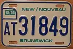 1986 | Embossed blue serial on reflective white plate; border lines around plate and around top corners; "NEW / NOUVEAU" and "BRUNSWICK" screened in turquoise centred at top and bottom respectively | none | AB12345 | issued | notes |