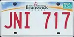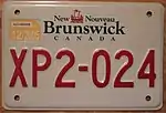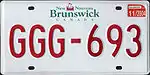 1991-2003 | Embossed red serial on reflective white plate; screened provincial wordmark (red galley graphic with "New" and "Nouveau" to the left and "Brunswick" to the right, all in green) centred at top | none | L12-345 | ||