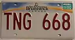 1991-2003 | Embossed red serial on reflective white plate; screened provincial wordmark (red galley graphic with "New" and "Nouveau" to the left and "Brunswick" to the right, all in green) centred at top | none | TAB 123 | ||