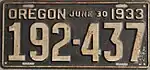 Embossed white serial on black plate with border line; "OREGON JUNE 30 1933" at top | 123-456 | 1 to approximately 250-000 | |