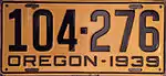 1939 | Embossed black serial on yellow plate with border line; "OREGON-1939" at bottom | 123-456 | 1 to approximately 344-000 | |