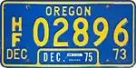 1973–85 | Embossed blue serial on golden yellow plate; border line around plate and around registration year sticker spot at bottom right; "OREGON" centered at bottom; month of expiration at bottom left | none | ABC 123 | First letter corresponds to month of expiration | Serials for each month continued from where the 1964–73 plates left off. |