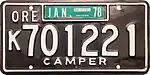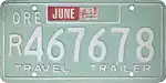 Travel Trailer | c. 1964–73 | White on pistachio green; "ORE" and sticker box at top and "TRAVEL TRAILER" at bottom | R123456 | R400001 to approximately R499500 | |