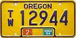 Tow Truck | Blue on gold; "OREGON" at top | T/W 12345 | T/W 00001 to present | Issued to individuals who tow vehicles not owned by them in tow and recovery operations for direct or indirect compensation. Also issued to businesses which must transport damaged, disabled or abandoned vehicles. | |