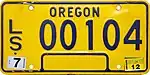 Low-Speed Vehicle | Blue on gold; "OREGON" at top and sticker box at bottom | L/S 12345 | L/S 00001 to ? | Issued to four-wheeled vehicles with a maximum speed of between 20 and 25 miles per hour. | |