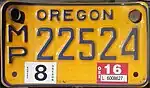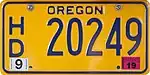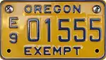 Government Exempt – Motorcycle/Moped | Blue on gold; "OREGON" at top and "EXEMPT" at bottom | E/9 12345 | |||