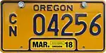 Medium-Speed Vehicle | Blue on gold; "OREGON" at top | M/S 12345 | M/S 00001 to present | Issued to four-wheeled electrical vehicles that are equipped with a roll cage or a crushproof body design and have a maximum speed of 35 miles per hour. | |