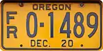 For-Rent | Blue on gold; "OREGON" at top and "DEC." and year of expiration at bottom | F/R 1-2345 | Issued to trailers having a loaded weight of 8,000 lb or less that are for hire and are equipped with pneumatic tires. All plates expire on December 31 of the stated year. | ||