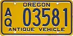 Special Interest | before c. 2004 | Blue on gold; "OREGON" at bottom | S/P 12345 | S/P 00001 to approximately S/P 10000 | Issued on vehicles that are maintained as collectors' items and are at least 25 years old. |