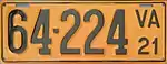 1921 | Embossed black serial on orange plate with border line; "VA 21" at right | 123-456 | 1 to approximately 146-000 | |