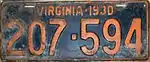 1930 | Embossed orange serial on black plate with border line; "VIRGINIA · 1930" centered at top | 123-456 | 1 to approximately 349-000 | |