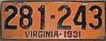 1931 | Embossed black serial on orange plate with border line; "VIRGINIA · 1931" centered at bottom | 123-456 | 1 to approximately 368-000 | |