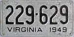 1949 | Embossed black serial on unpainted aluminum plate; "VIRGINIA 1949" at bottom | 123-456 | 1 to approximately 698-000 | |