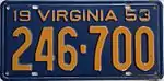 1953 | Embossed orange serial on blue plate; "19 VIRGINIA 53" at top | 123-456 | 1 to approximately 940-000 | |