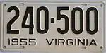 1955 | Embossed black serial on white plate; "1955 VIRGINIA" at bottom | 123-456 | 1 to 999-999 | |