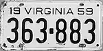 1959 | Embossed black serial on white plate; "19 VIRGINIA 59" at top | 123-456 | 1 to 999-999 | |