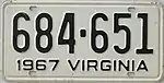 1967 | Embossed black serial on white plate; "1967 VIRGINIA" at bottom | 123-456 | 1 to 999-999 | |