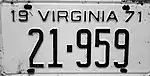 - 1 2 Kretschmer, Rick. "Virginia Passenger Cars 1933-1972". Rick Kretschmer's License Plate Archives. Retrieved July 3, 2018.