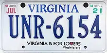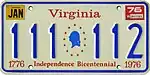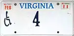 - ↑ Kretschmer, Rick. "Virginia Passenger Cars 1973-Present". Rick Kretschmer's License Plate Archives. Retrieved August 26, 2019.