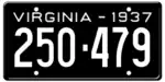 1937 | Embossed white serial on black plate; "VIRGINIA - 1937" at top | 123-456 | 1 to approximately 375-000 | |
