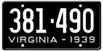 1939 | Embossed white serial on black plate; "VIRGINIA - 1939" at bottom | 123-456 | 1 to approximately 402-000 | |