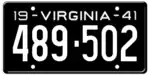 1941 | Embossed white serial on black plate; "19 - VIRGINIA - 41" at top | 123-456 | 1 to approximately 491-000 | |