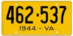 1944 | Embossed black serial on yellow plate; "1944 - VA" centered at bottom | 123-456 | 1 to approximately 468-000 | |
