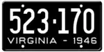 1946 | Embossed white serial on black plate; "VIRGINIA - 1946" at bottom | 123-456 | 1 to approximately 524-000 | |