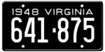 1948 | Embossed white serial on black plate; "1948 VIRGINIA" at top | 123-456 | 1 to approximately 642-000 | |