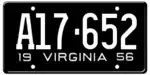 1956 | Embossed white serial on black plate; "19 VIRGINIA 56" at bottom | 123-456 | 1 to 999-999 | |