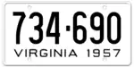 1957 | Embossed black serial on white plate; "VIRGINIA 1957" at bottom | 123-456 | 1 to 999-999 | |