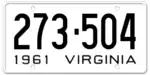 1961 | Embossed black serial on white plate; "1961 VIRGINIA" at bottom | 123-456 | 1 to 999-999 | |