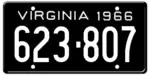 1966 | Embossed white serial on black plate; "VIRGINIA 1966" at top | 123-456 | 1 to 999-999 | |