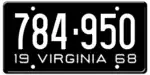 1968 | Embossed white serial on black plate; "19 VIRGINIA 68" at bottom | 123-456 | 1 to 999-999 | |
