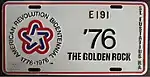 1976 Large American Revolution Bicentennial Logo left; serial number right of center at top with large " '76 " and smaller slogan below; stacked "ST. EUSTATIUS. N.A." at far right The Golden Rock E123 The design features the United States' Bicentennial Logo commissioned by the American Revolution Bicentennial Commission.