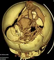 | Axial image from computerized tomography angiogram showing arteriovenous communication in vein of Galen malformation | |