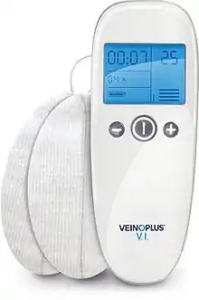 Veinoplus technology is based on the principle of electrostimulation. Thanks to a 9V battery, the device delivers electrical impulses with low frequency and low voltage. Input power is below 0.3W and output power is under 0.05W. The difference between Veinoplus and others electrical muscle stimulators is due to the waveform of the impulses. With this unique waveform, the electrical field can deeply get through the calf and so stimulate an important volume of tissue. As a consequence, Veinoplus triggers deep muscular contractions even if both electrodes are over one meter apart, for instance with one electrode on each calf.[2]