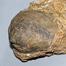 These snails had a heavy, oval shell reaching a length of about 30 millimetres (1.2 in). The earliest regular windings are visible at the top of the shell.