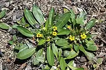 Velleia montana is a small herbaceous plant to 15 cm (5.9 in) high that forms a rosette. The leaves are oblanceolate to obovate, 1.5 to 8 cm (0.59 to 3.15 in) long, 6 to 30 mm (0.24 to 1.18 in) wide with toothed or smooth margins. The three sepals are separated, upper sepal oval to oblong-shaped and 5–6 mm (0.20–0.24 in) long. The yellow corolla is 7 to 10 mm (0.28 to 0.39 in) long, inner and outer surface covered with short, soft hairs. The scapes grow horizontally to 10 cm (3.9 in) high and mostly shorter than the leaves. The bracteoles are more or less linear-shaped, separated, up to 5 mm (0.20 in) long. Flowering occurs from November to February and the fruit is a more or less spherical shaped, flattened, hairy capsule about 2 mm (0.079 in) in diameter.[3][4]