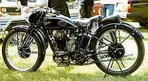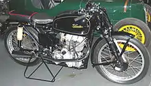 The Velocette KTT is a racing British motorcycle made by Velocette. The most significant variant of the Model K series of overhead camshaft Velocette motorcycles, the TT designation indicated the machine was intended for racing, and was an early example of a 'production racer' (although KTTs could be ordered as road-legal machines).[1] The Velocette KTT was notable for having the first positive-stop foot gear change on a motorcycle, and the first with a swingarm rear suspension using separate shock absorber units.[2] The foot shift innovation significant improvement for racing, and quickly replaced the hand gear change lever, and became the standard for almost all motorcycles to this day. Veloce's swingarm suspension also had profound and lasting effects on the motorcycle industry, and remains the standard for motorcycle rear suspension to this day.[2]