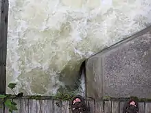Just beyond the Swartswood Lake Dam, the river is forced to narrow by a concrete bridge support. Flow separation is evident at the sharp bend, just above the vena contracta