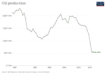 Since 2014, oil production in Venezuela has suffered from a poor oil market and Venezuela's insufficient funding of the industry. Venezuela's nationalistic oil policies have not succeeded in making them more independent from their oil customers. In 2016, the United States imported 291,461,000 barrels of oils from Venezuela, an amount consistent with imports in the five years prior.[46] To assuage the oil price decline which began back in June 2014 and continues through to today, President Maduro printed more currency, resulting in inflation as high as 700% of what the inflation rate was in 2014.[47] The Economic policy of the Nicolás Maduro administration did not revive the oil decline, and by 2016, the oil production reached the lowest it had been in 23 years.[48] According to analysts, the economic crisis suffered under President Nicolás Maduro would have still occurred with or without Chávez.[49]