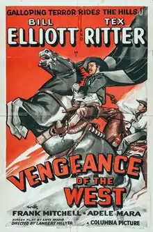 Vengeance of the West is a 1942 American Western film directed by Lambert Hillyer and written by Luci Ward. The film stars Wild Bill Elliott, Tex Ritter, Frank Mitchell, Adele Mara, Dick Curtis and Robert Fiske. The film was released on August 16, 1942, by Columbia Pictures.[1][2][3]