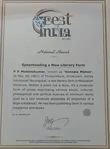 - 2020 - Spearheading a New Literary Form - Vennala Mohan features in Best-of-India Records (BIR) [3][4]